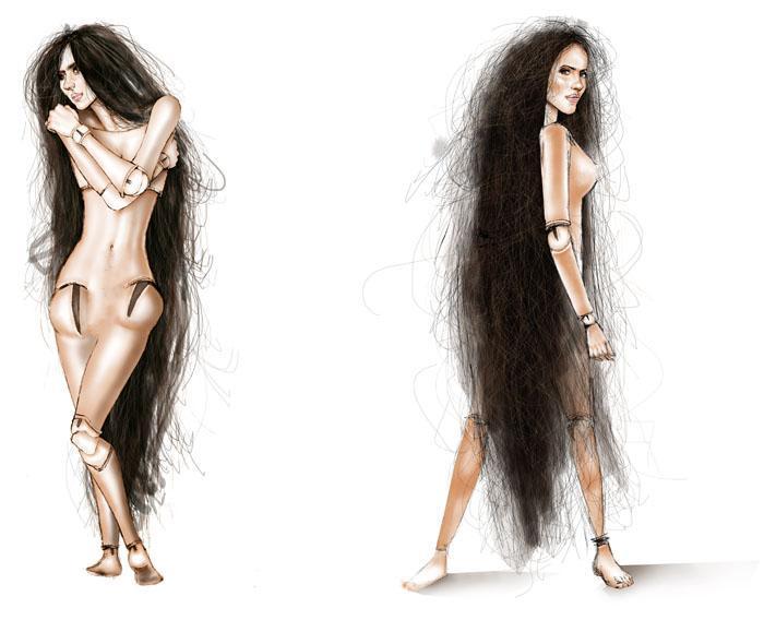Blue or brown nude females with backwards feet.