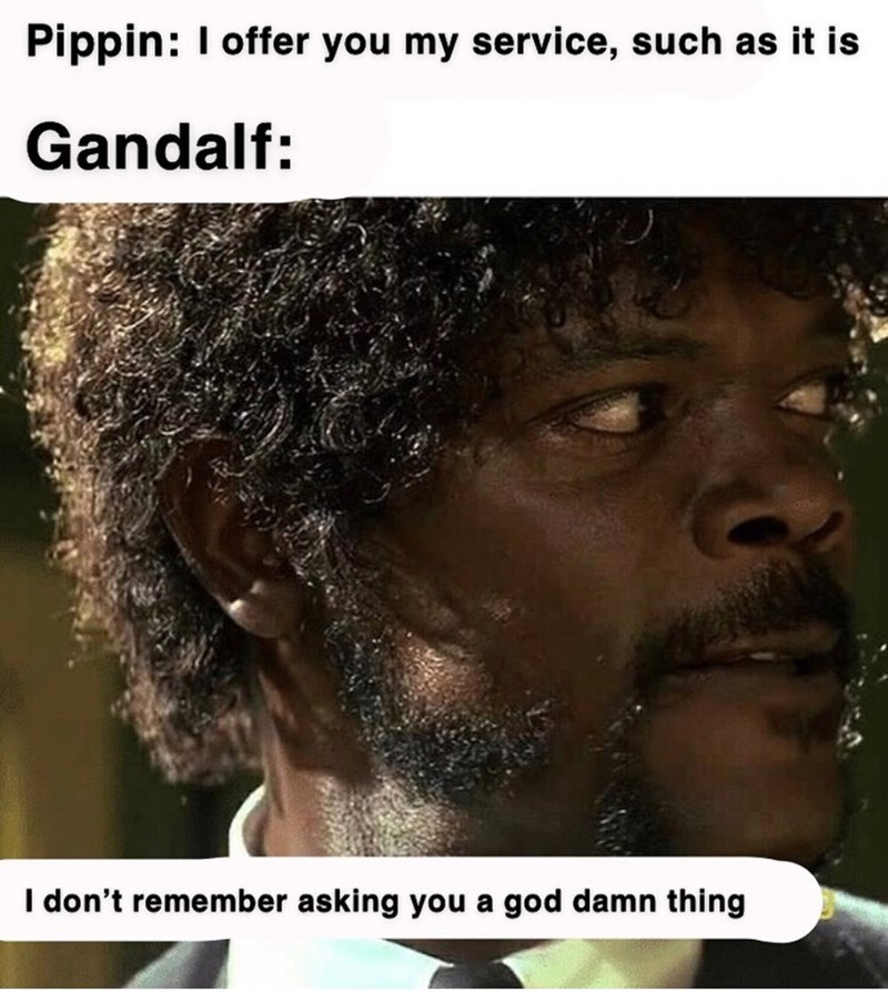 Gandalf pippin memes. This hobbit was the most curious of the four that appeared in the trilogy and he managed to cause a lot of his own problems before taking up his arms and fighting for the free peoples of middle earth. Make gandalf and pippin memes or upload your own images to make custom memes. Easily add text to images or memes. The creature hailed from morgoth and it was one of the only things gandalf was ever truly afraid of but when the wizard finally confronts his foe he certainly doesn t show his fear allowing the fellowship to get as far away as possible before he takes on the balrog himself telling it you shall not pass. The joke of this meme is genuinely pretty interesting. See more ideas about the hobbit hobbit memes lotr. One of the most popular gandalf memes involves a statement he makes to an attacking balrog in the fellowship of the ring.